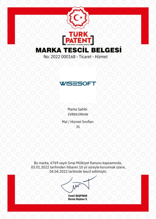 Wise Soft firmasına ait marka patent belgesidir. Wise Ticaret, Wise Soft Markasıdır.